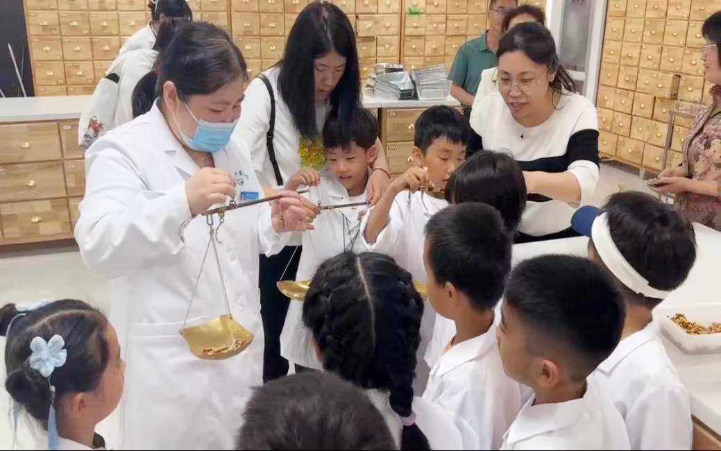此外,邵珠瑩藥師還帶領(lǐng)小朋友們體驗了如何使用戥秤,只見他們一手拎稱桿,一手扶秤砣,瞪大眼睛瞄準(zhǔn)刻度,認(rèn)真又負(fù)責(zé),真實(shí)體驗了一把臨中醫(yī)“小藥師”的工作。
