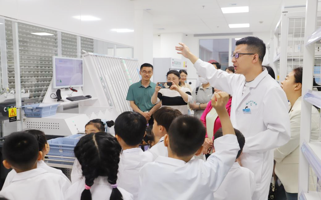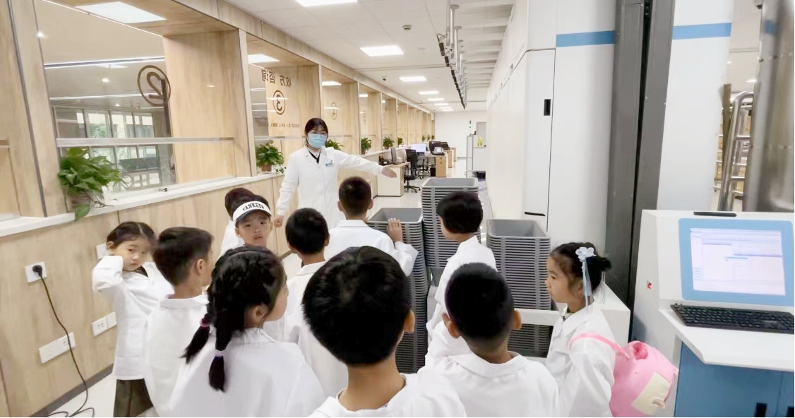 活動中小朋友們興致勃勃地參觀各個藥房,了解了各個藥房的工作職能,近距離感受藥師工作的辛勤。門診中藥飲片藥房謝亞欣藥師以及門診西成藥房劉彥東藥師分別帶領(lǐng)小朋友們參觀藥房并講解和演示全自動發(fā)藥機(jī)的工作流程,讓小朋友真切的體會到智慧藥房的先進(jìn)及便利。